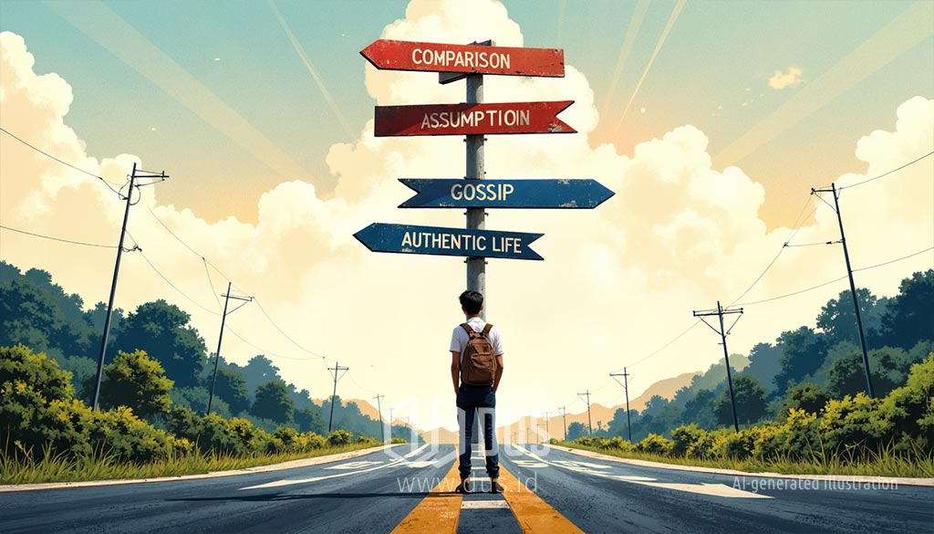 Lebih berbahaya lagi, kebiasaan membandingkan bisa menjadi salah satu akar psikologis yang memicu asumsi. Saat merasa minder, kita mencari alasan cepat untuk menutup celah: “Dia sukses karena punya koneksi, bukan karena kerja keras.” Saat merasa superior, kita menjustifikasi ego dengan dugaan: “Dia hanya terlihat pintar, sebenarnya biasa saja.” Dari asumsi inilah sindiran dan gosip mudah tumbuh, merusak relasi sosial yang sehat.